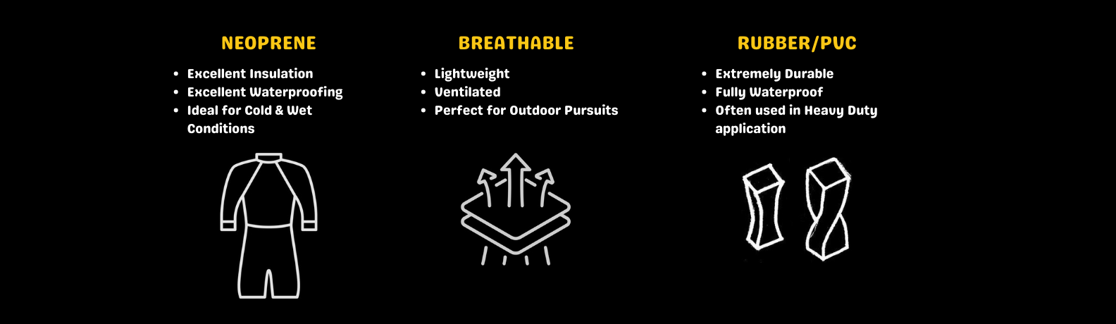 - Neoprene: Excellent insulation and waterproofing; ideal for cold & wet conditions.