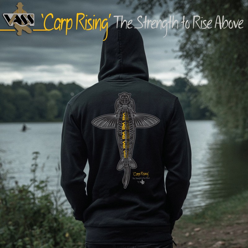 The Vass 'Carp Rising' design illustrates 'The Strength to Rise Above' The enlarged Pectoral fins represent wings taking flight to ‘Rise Above’. The slogan includes 'The Strength’ relating to the inner strength needed to keep pushing even when times get tough, believing that you have the strength to 'Rise Above’ and succeed. This not only relates to fishing but also the journey of life itself!