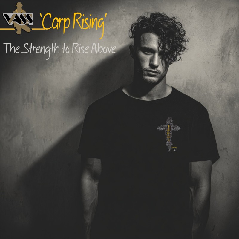 The Vass 'Carp Rising' design illustrates 'The Strength to Rise Above’. The enlarged Pectoral fins represent wings taking flight to ‘Rise Above’.